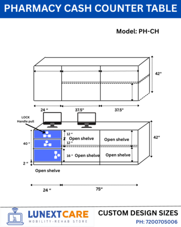 1) Lockable top drawers: Secure storage for cash, prescriptions & daily billing records