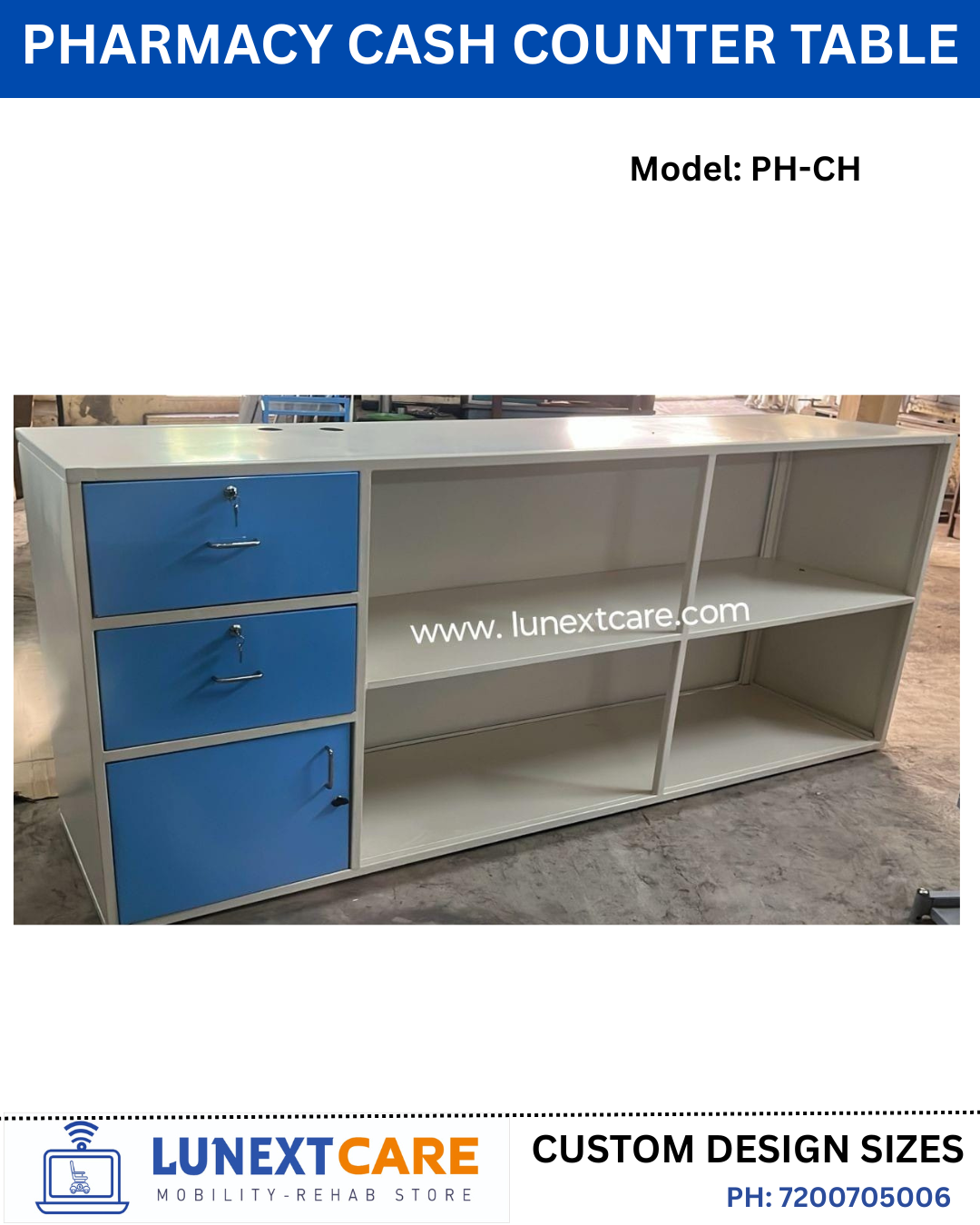 Model PH-CH counter — white/cream powder-coated steel body with blue accent drawers (2 lockable drawers + 1 cabinet door on the left) and open shelving on the right side with 2 shelves and a vertical divider. Let me create a product spec card matching this exact design at your dimensions.