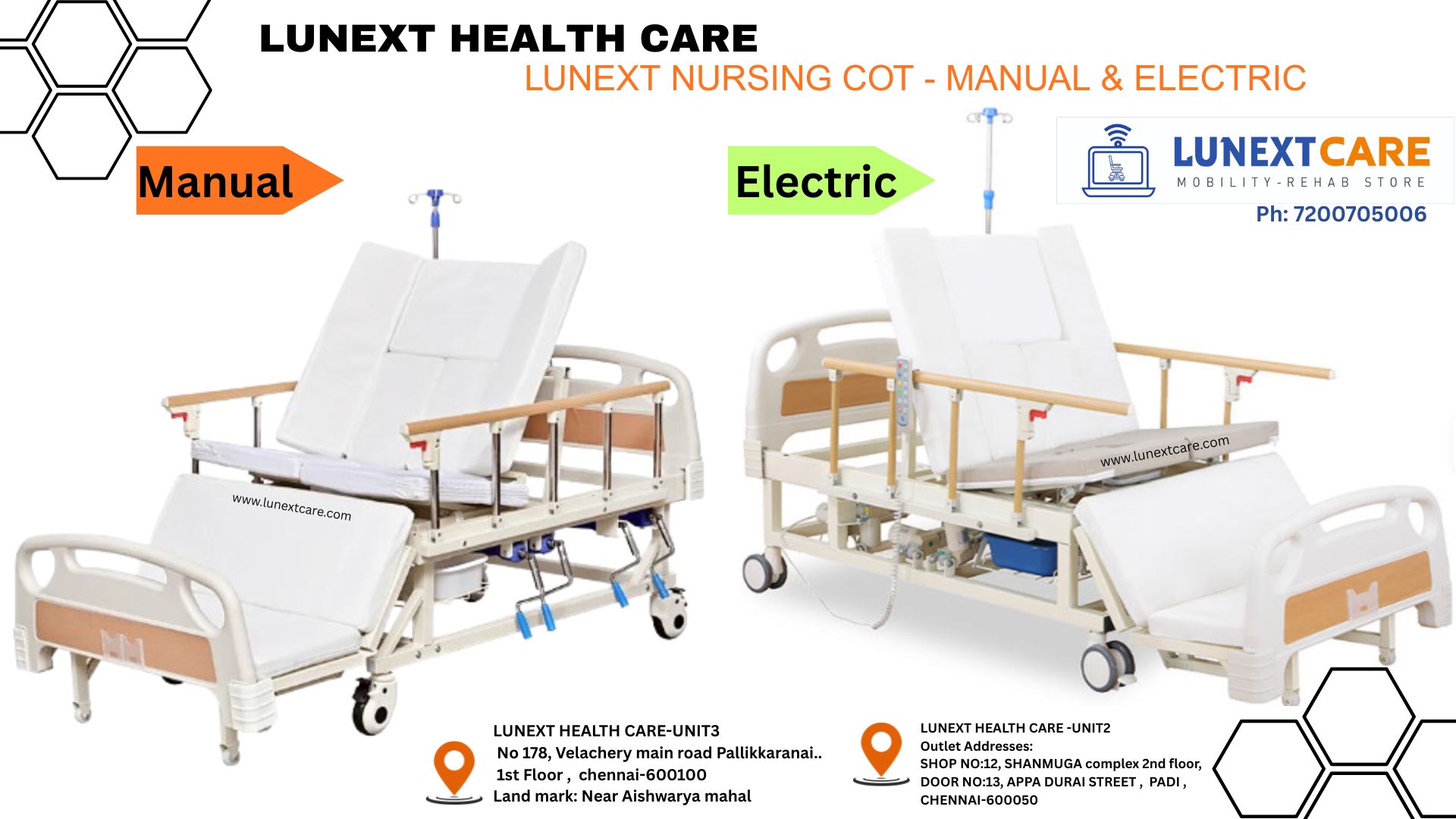 LUNEXT Nursing Cots Include both ELECTRIC & MANUAL function Nursing Cots- the choice depends on the patient’s medical needs, required support level, and budget, with ‘nursing cot’ often implying a focus on domestic/caregiver home convenience.