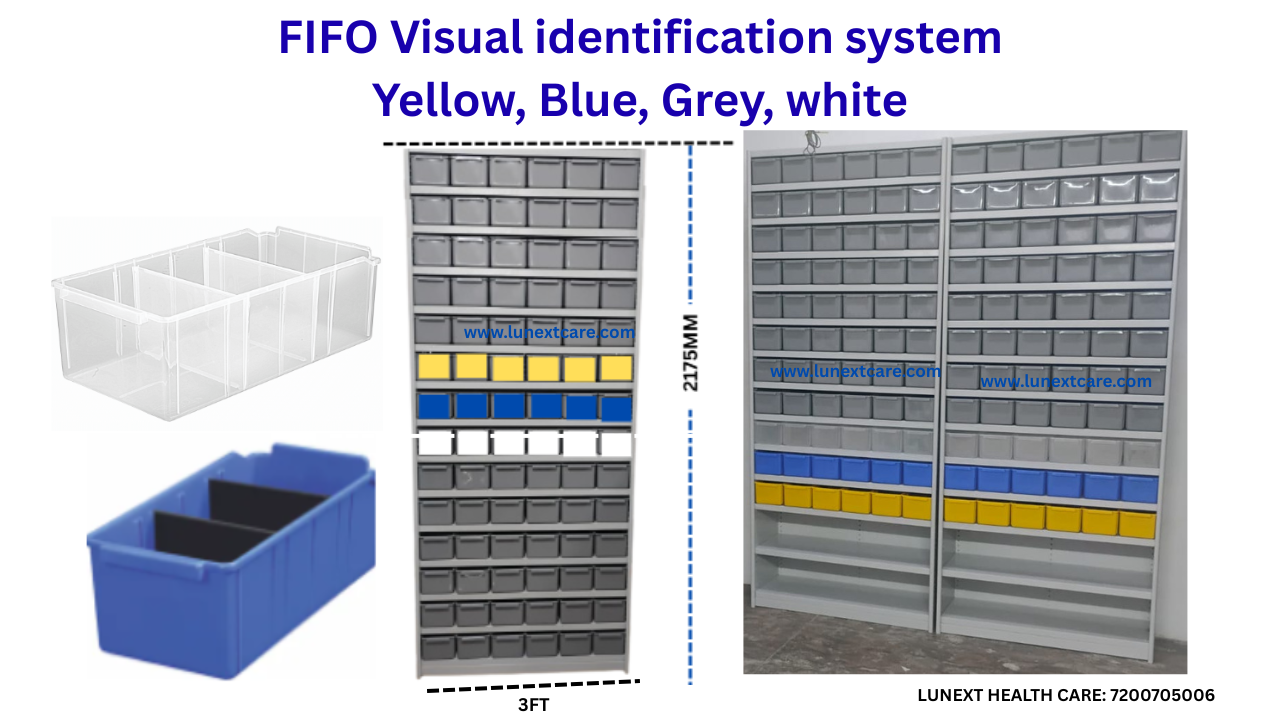 - To implement FIFO (First-In, First-Out) using color-coded bins, you use Visual system . This removes the need for staff to check individual expiry dates every time they pull a medication.