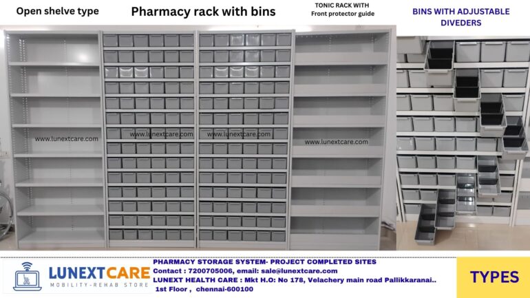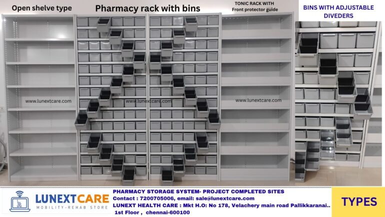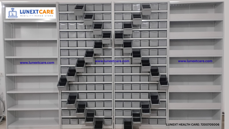LUNEXT Modular pharmacy racks with color-coded bins are professional storage systems designed to maximize space and reduce medication dispensing errors. In Chennai, these systems are primarily manufactured using high-quality Mild Steel (MS) or CRCA sheets with a powder-coated finish for durability and hygiene.