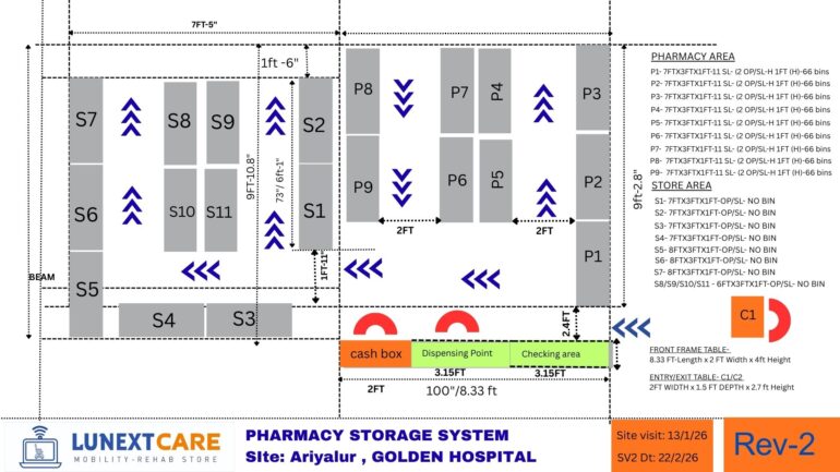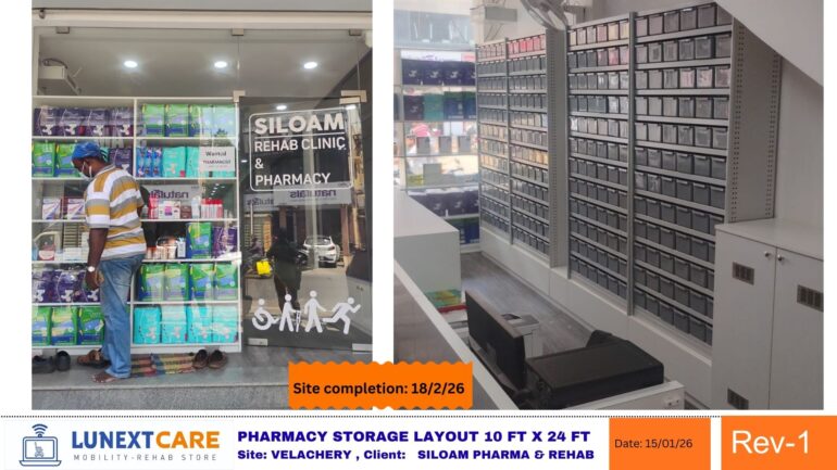 LUNEXT PHARMACY RACKS PROJECTS – LUNEXT HEALTH CARE offers customized pharmacy racks tailored to specific needs. LUNEXT products are manufactured in Chennai and are available at competitive rates, aimed at enhancing pharmacy organization and efficiency with durable, modular storage solutions.