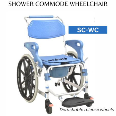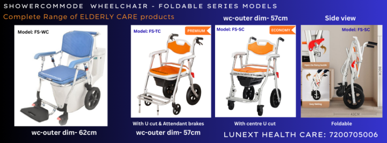 LUNEXT SHOWER COMMODE WHEELCHAIR model specialized in Multifunctional SHOWER COMMODE applications with 3 Quick FOLDABLE SHOWER COMMODE WHEELCHAIR models, 1 BARIATRIC SHOWER COMMODE WHEELCHAIR model, 1 HEIGHT ADJUSTABLE SHOWER COMMODE WHEELCHAIR model , 1 STAINLESS STEEL SHOWER COMMODE WHEELCHAIR Models with price range starting from INR 12300/- To 22500/-