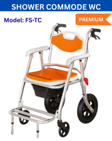 LUNEXT SHOWER COMMODE WHEELCHAIR Model: FS-TC – Foldable shower commode , WC outer dim: 58CM, Attendant Brakes & Footrest stool, Aluminium frames comes with Centre U CUT Type commode & can roll over commode- Compact Max load: 100kg