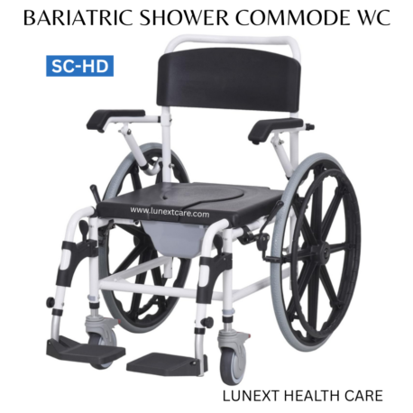 Model: SC-HD – Biariatric shower commode , Flipup armrest & detach legrest, Quick release wheels-Height adjustable Shower commode — Aluminium frames comes with commode & can roll over western commode- Compact Max load: 110kg
