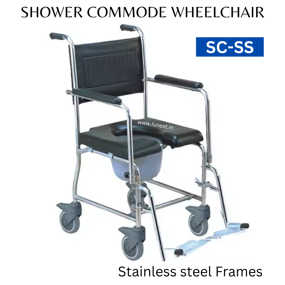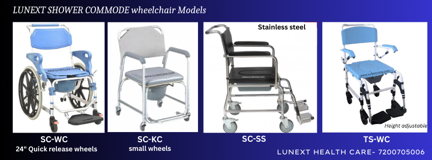 LUNEXT SHOWER COMMODE WHEELCHAIR model specialized in Multifunctional SHOWER COMMODE applications with 3 Quick FOLDABLE SHOWER COMMODE WHEELCHAIR models, 1 BARIATRIC SHOWER COMMODE WHEELCHAIR model, 1 HEIGHT ADJUSTABLE SHOWER COMMODE WHEELCHAIR model , 1 STAINLESS STEEL SHOWER COMMODE WHEELCHAIR Models with price range starting from INR 12300/- To 22500/-
